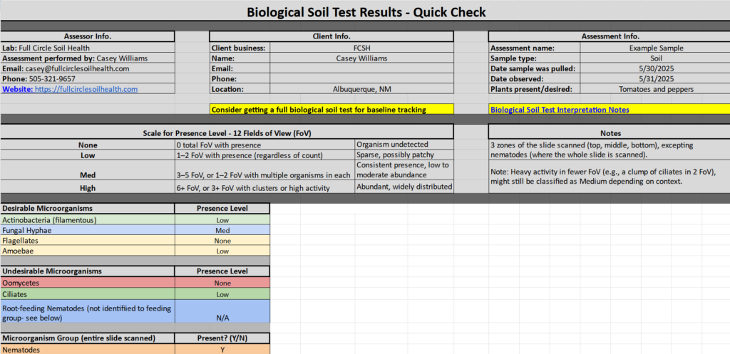 Our Full Assessment provides a detailed, microscope-based analysis of your soil’s biological health. We examine and count a full sample to qualitatively assess the types and approximate biomass or abundance of key soil organisms — including bacteria, fungi, protozoa, and nematodes. This service offers valuable insights into your soil food web and ecosystem function, helping you target your soil management for long-term health and productivity.